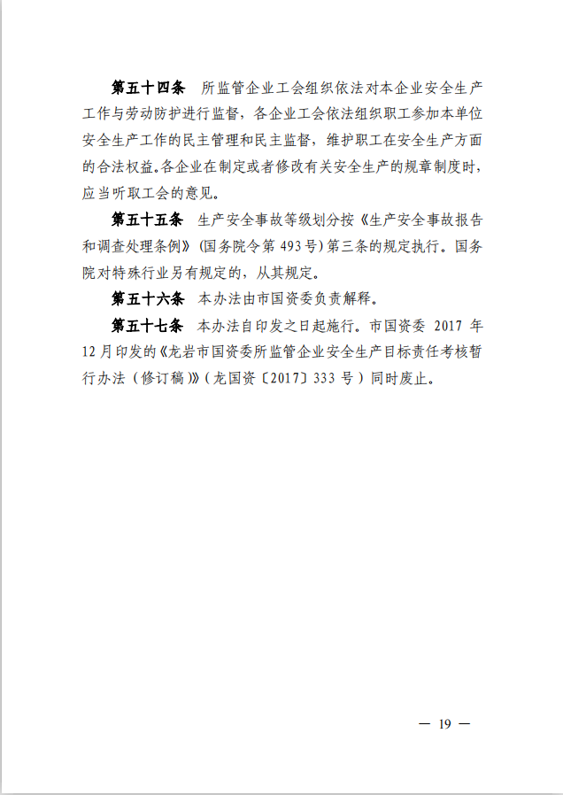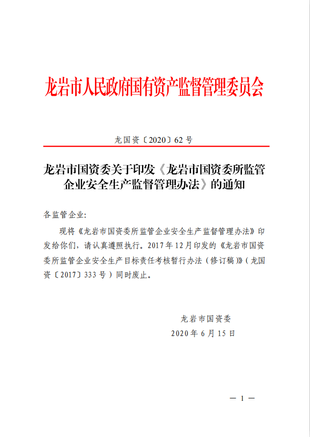 龍巖市國(guó)資委關(guān)于印發(fā)《龍巖市國(guó)資委所監(jiān)管企業(yè)安全生產(chǎn)監(jiān)督管理辦法》的通知(龍國(guó)資[2020]62號(hào))